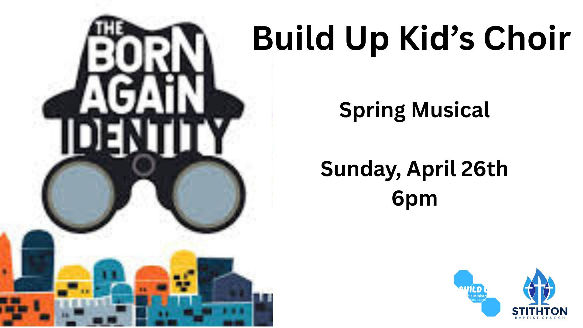 Build Up Kid's Spring PlaySunday, April 26, 2026 at 6:00pmCome experience the mysterious encounter between Nicodemus and Jesus with our Spring Kid's Musical!